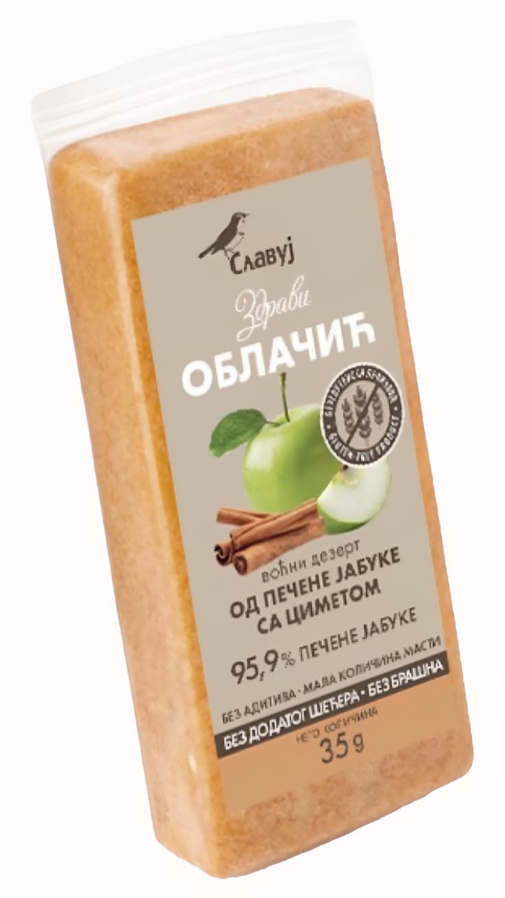 Jedinstvena RUČNO RAĐENA POSLASTICA od pečenih jabuka sa cimetom, pripremljena po starinskom receptu slovenskih domaćica! BEZ DODATOG ŠEĆERA. BEZ BRAŠNA. BEZ ADITIVA. 95,9% PEČENE JABUKE. Izgleda jednostavno, a u stvari je pravi kulturni artefakt slovenske gastronomije, kao neki stari muzički instrument – samo jestiv. Pravi se tako što se pečene jabuke pretvore u gusti pire, zatim se umute sa belancetom da postanu vazdušaste, pa se suše na niskoj temperaturi. U receptu nema šećera – jabuke same daju dovoljno slatkoće i kiseline. Dobija se nešto između suflea i starinske marmelade, ali sa življom teksturom i pravim ukusom jabuke. Danas se ceni zbog minimalističkog recepta i izvornog ukusa jabuke – bez aroma, pojačivača, glukoze i moderne hemije. Velika je podpora zdravlju.